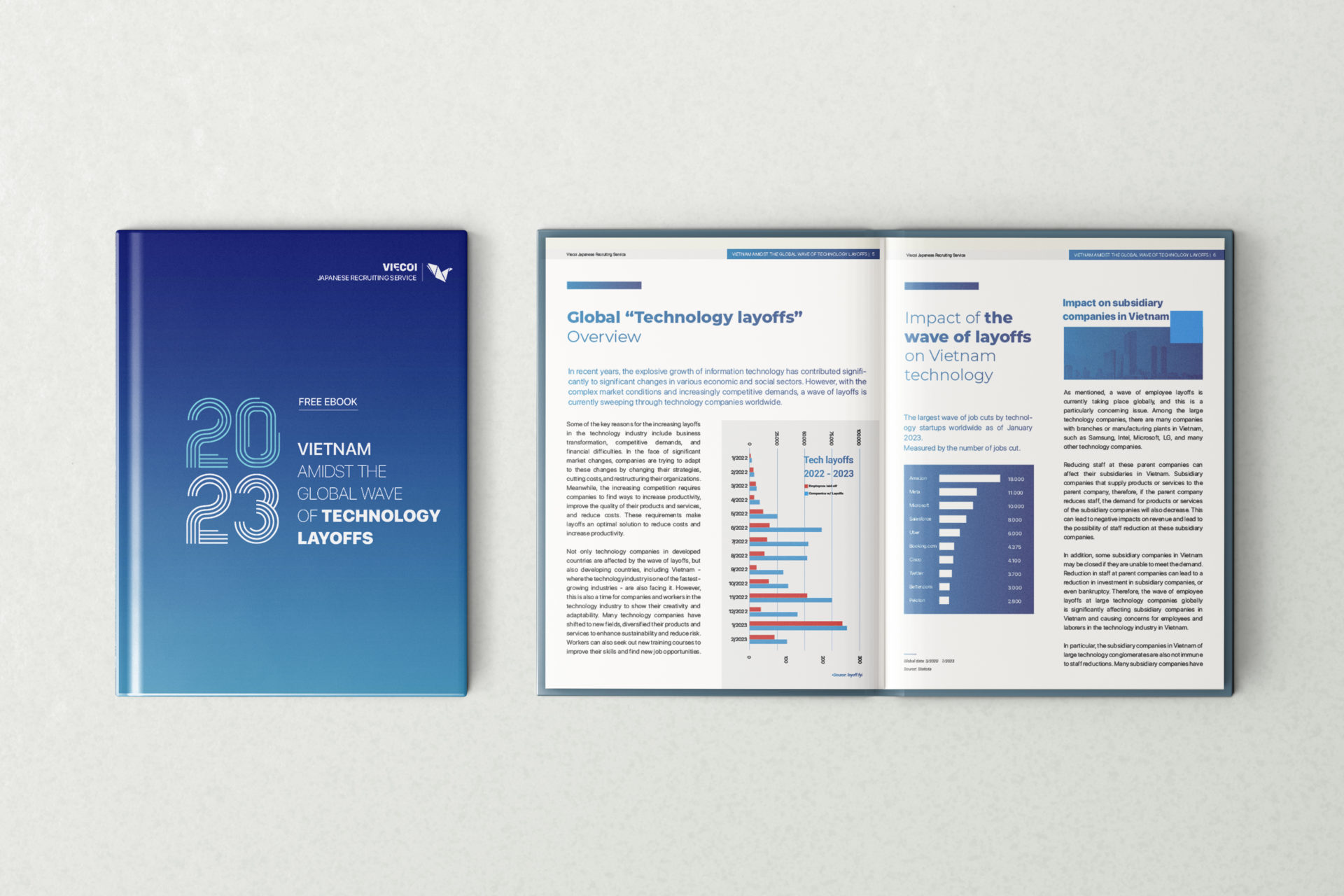 The ebook “Vietnam amidst the global wave of technology layoffs” is written with the aim of providing businesses with an overview of the global layoffs situation and its impact in Vietnam. In addition, the ebook also provides information on solutions, policies, prospects, and strengths of the technology industry in Vietnam in this context, helping businesses to grasp the current situation and make reasonable decisions and plans to cope with this difficult situation.